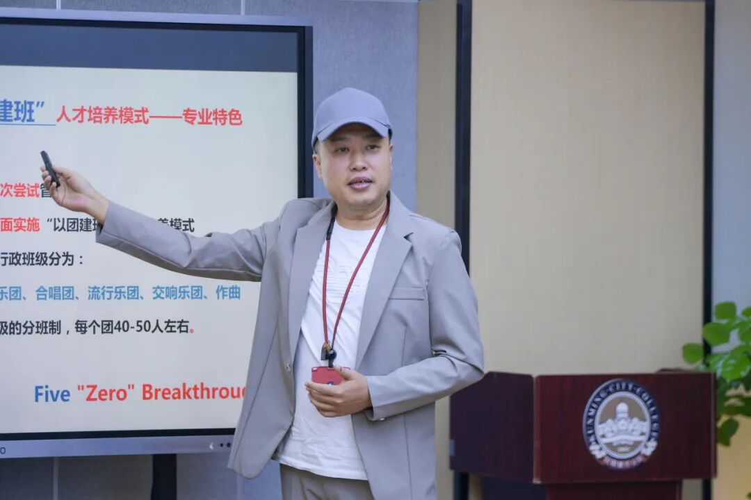 艺术学院教师陈星瑜介绍我校音乐教育的特色办学情况。他提到,艺术学院音乐教育以“以团建班”人才培养模式为核心,形成“以演促学、以团育人”的特色路径。在这一模式下,学院在音乐教育实践方面实现了质的飞跃:一是通过专业教师驻校指导、课程资源输出,助力多所中小学组建合唱团、管弦乐团等学生团体;二是落地“陇川美育浸润计划”,通过定期支教、课程共建等方式,将高校专业优势与地方民族音乐特色结合,为当地学生提供高质量美育课程;三是学生专业能力显著提升,先后斩获州级一等奖、省级一等奖,验证了教学模式的有效性;四是推动“高雅艺术进校园”常态化,将交响乐、民族管弦乐等经典演出带入合作院校,覆盖师生超万人次,提升学生审美素养;五是与地方政府深度合作开展文化惠民活动,通过音乐展演、艺术培训等服务市民文化需求,强化了音乐教育的社会价值。这一模式以乐团为纽带,串联起教学、实践、服务与育人全链条,形成了“学-练-演-创”的特色育人闭环,成为艺术学院音乐教育区别于传统分班制的鲜明亮点。