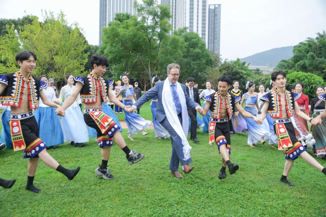 10月24日上午,学校海源校区时光草坪上洋溢着浓郁的民族风情与热烈的国际友谊氛围。我校艺术学院学生身着少数民族服饰,以一场别具特色的民族歌舞表演,向远道而来的卢克·多尔曼教授致以最诚挚的欢迎。