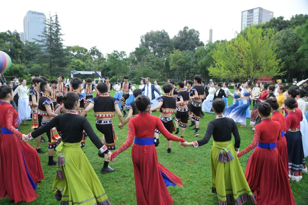 交流活动伊始,我校学生身着多民族传统服饰,以歌舞展现多彩民族文化。悠扬的旋律、轻盈的舞步在草坪上交织回荡,现场师生手拉手围成圆圈共舞,欢笑声与民族乐器声此起彼伏。热烈而真挚的氛围,让初到昆城的卢克·多尔曼教授深切感受到“音乐无疆,文化同鸣”的温暖力量,也为当天的学术交流活动拉开了充满人文情怀的序幕。