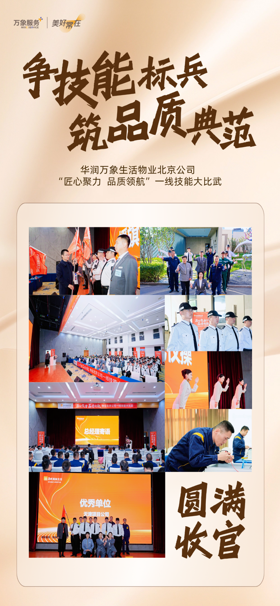 卓越的服务,源于专业技能的坚实根基。10月21日,华润万象生活物业北京公司举行“匠心聚力 品质领航”一线技能大比武。来自京津冀晋4省市的10支参赛队伍、93名岗位精英在竞技场上展开了激烈的角逐,旨在通过以赛促练的方式,持续锤炼团队的专业能力,为服务品质的不断提升注入核心动力。