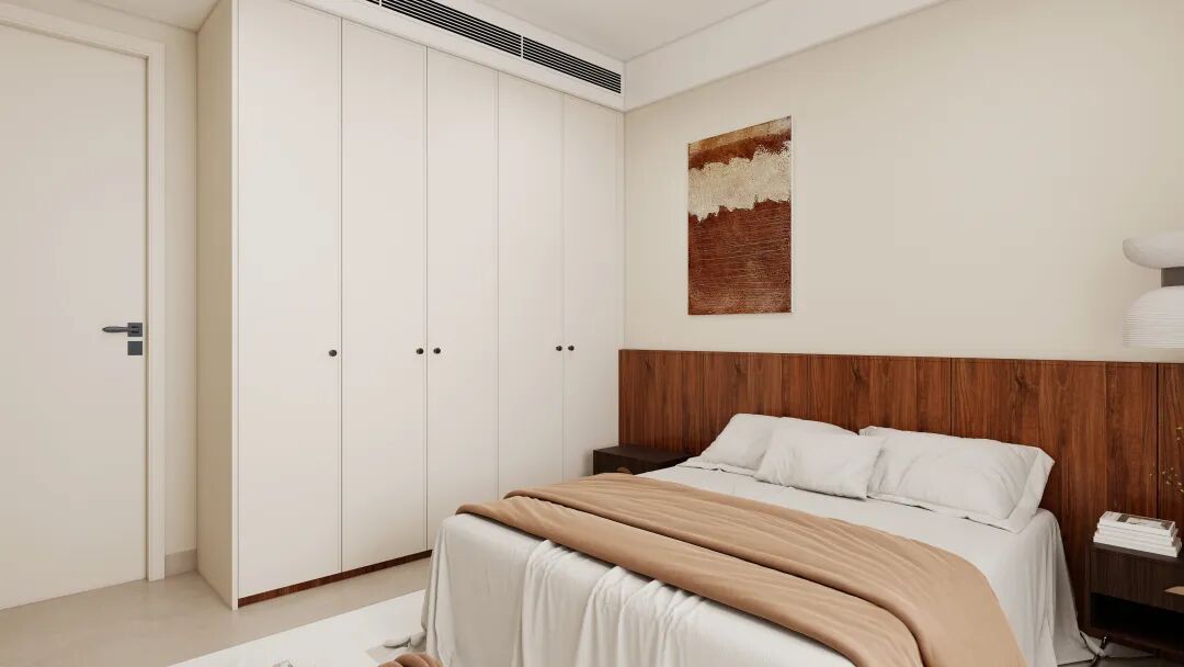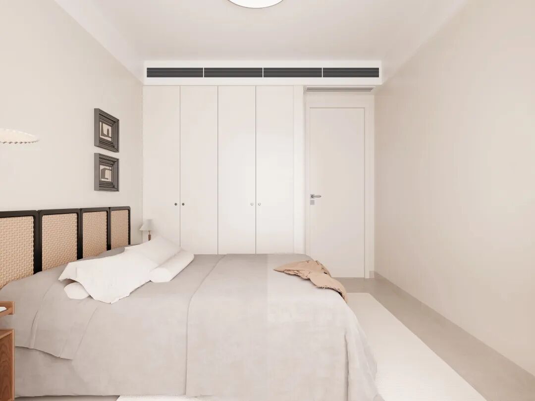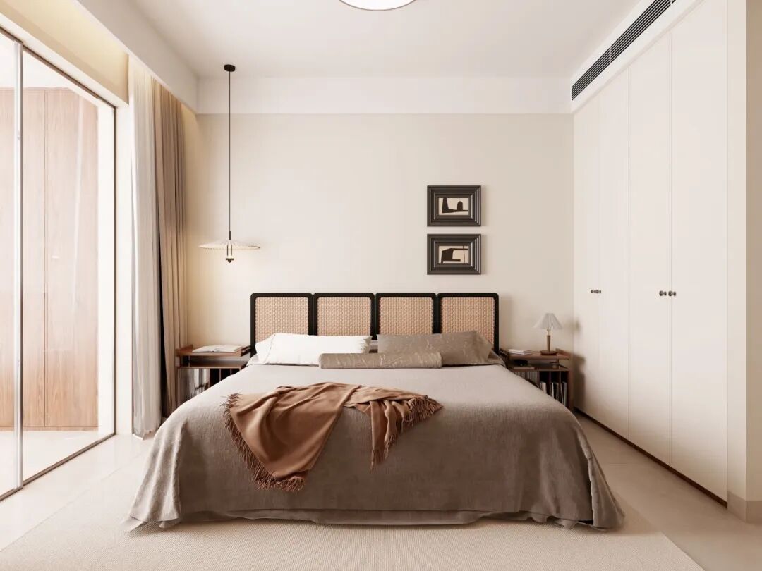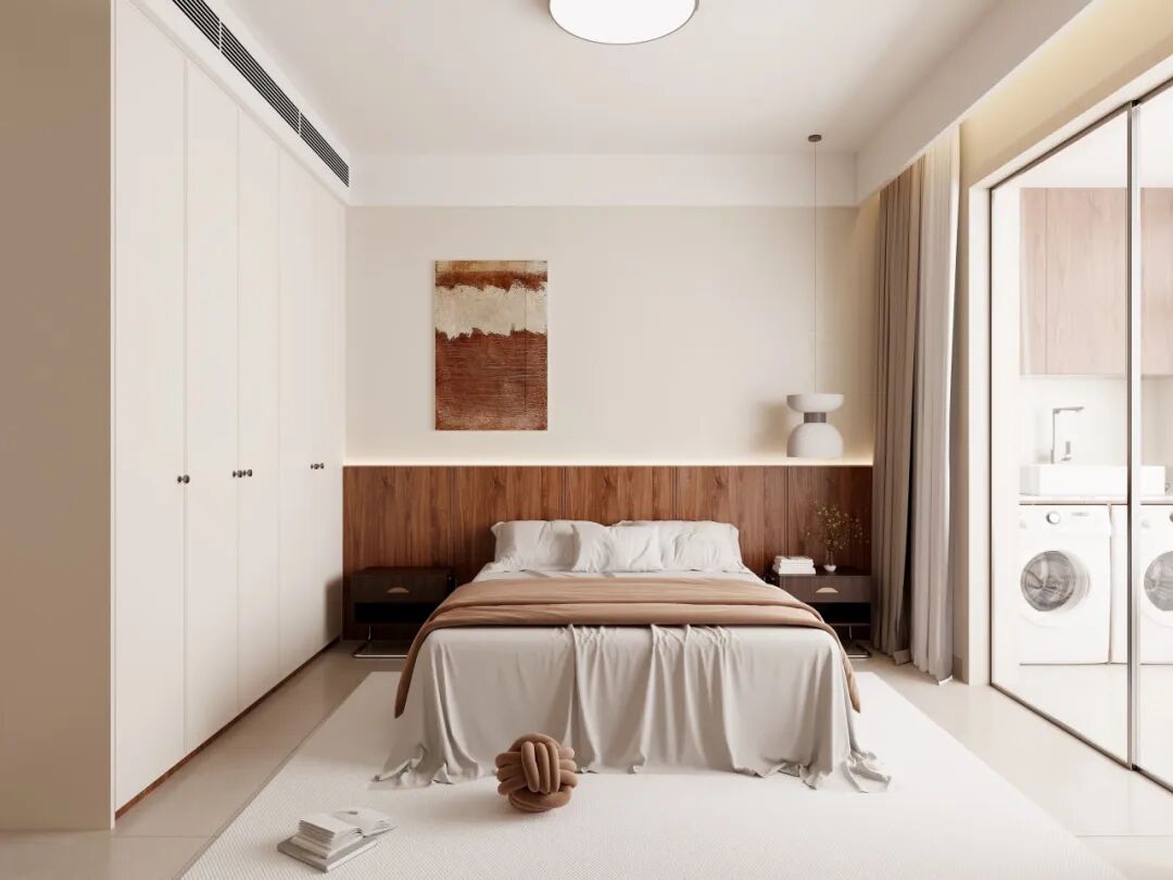 主卧通过自然光、原木、光影与纯白的协同,空间在现代简约中融入侘寂的质朴与中古的温暖。