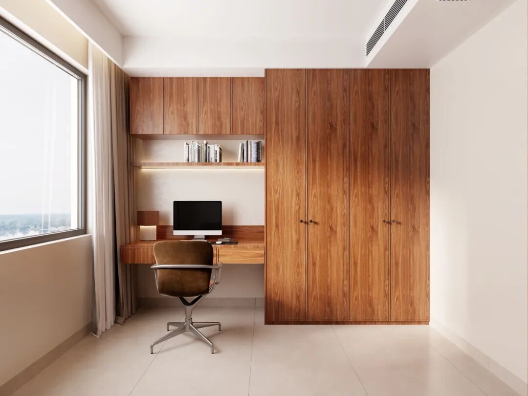 书房通过一体化定制实现功能与美学的平衡。原木色书桌与储物柜沿墙布局,形成连贯的功能界面,既节约空间又保持视觉统一。
