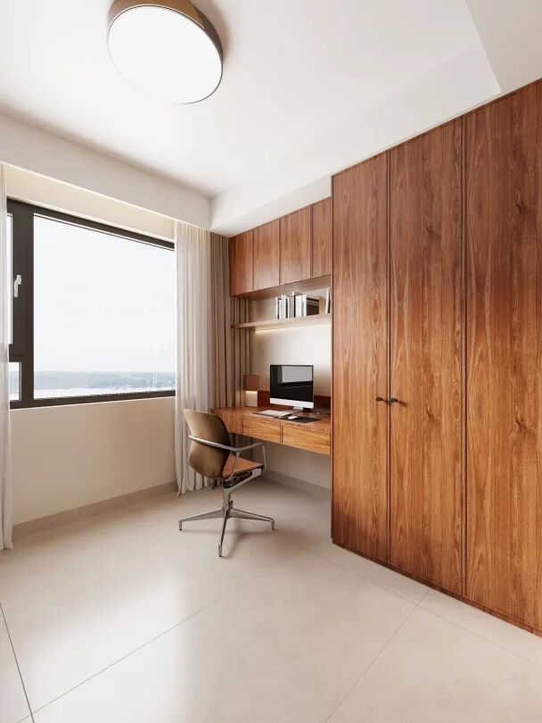 开放式与封闭式储物结合,满足收纳与展示需求。材质选用突出自然质感,与留白墙面共同营造出宁静致远的学习氛围。