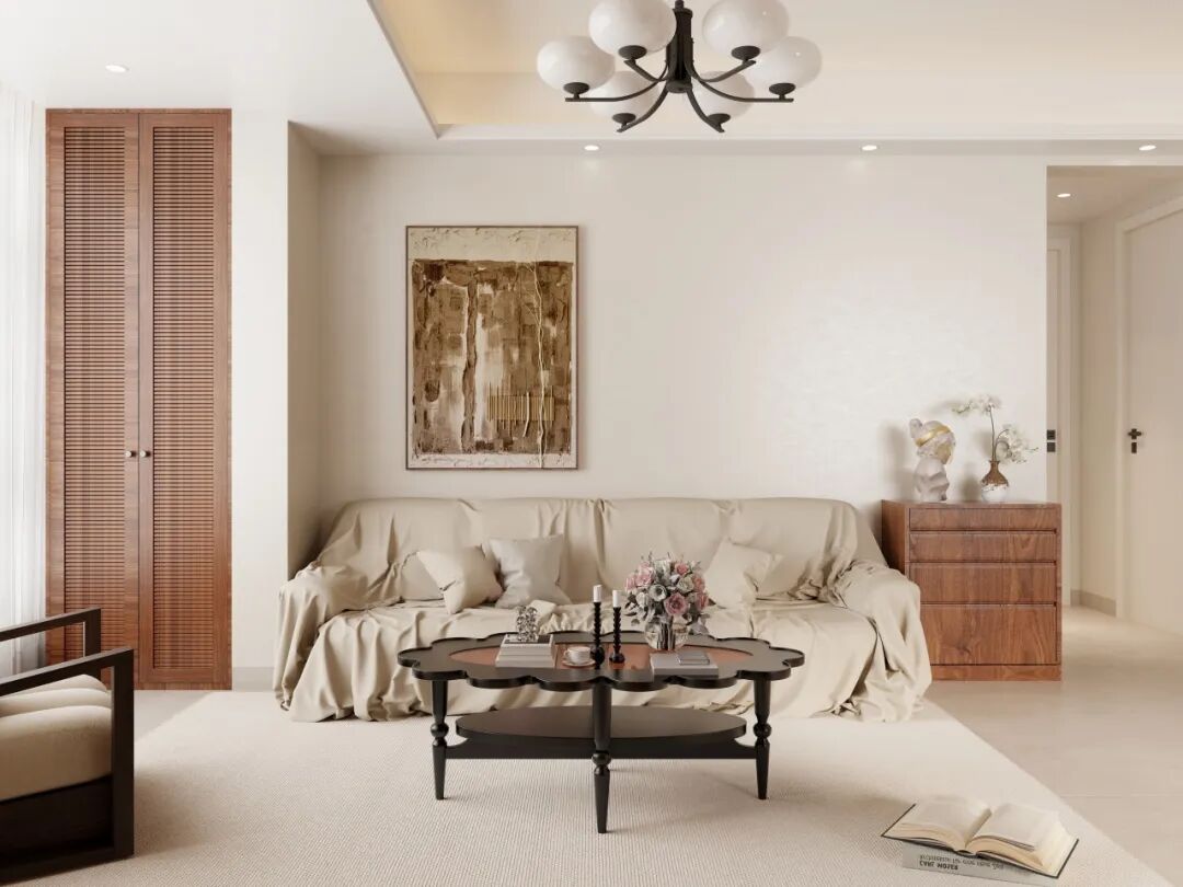 客厅作为侘寂中古风的视觉核心,通过精选陈设展现独特美学。