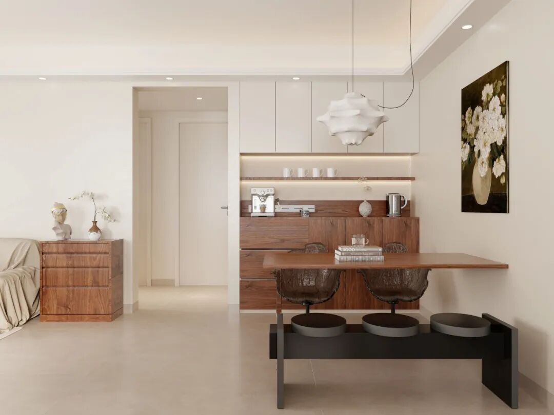 蚕丝吊灯与中古挂画共同塑造光影层次,后方"上白下原木"餐边柜既提供充足储物空间,又通过色彩搭配与整体风格保持和谐统一。