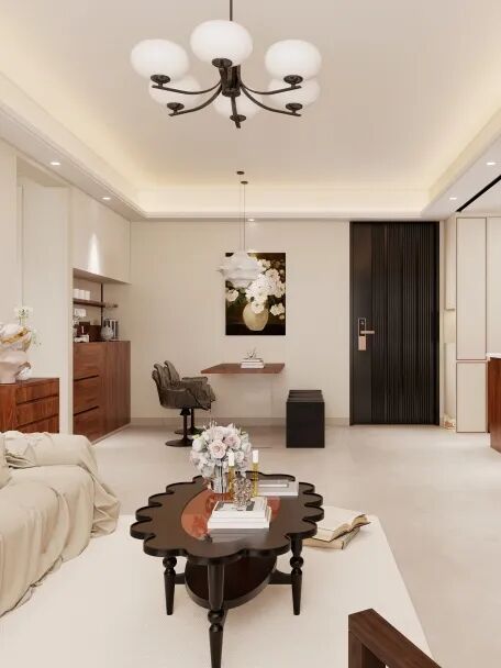 异形茶桌搭配柿子造型吊灯以圆润形态平衡空间线条。岁月质感的中古风五斗柜,雕塑摆件为空间注入艺术气息,体现"物与时光"的侘寂美学。