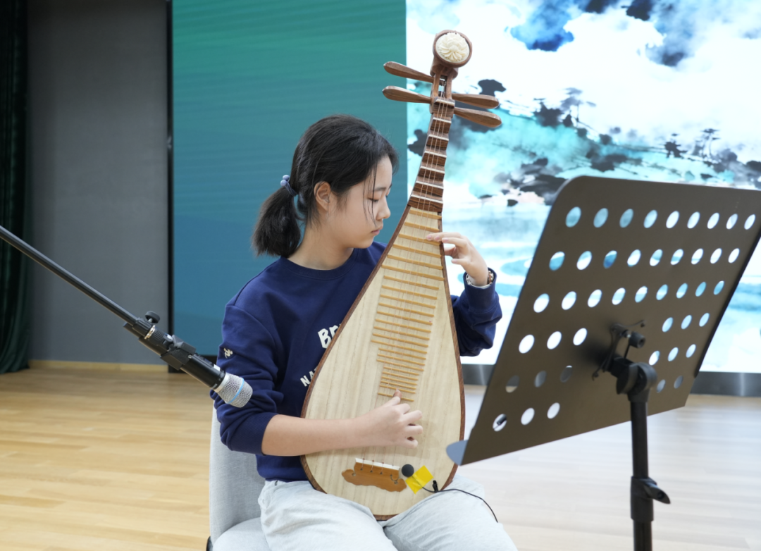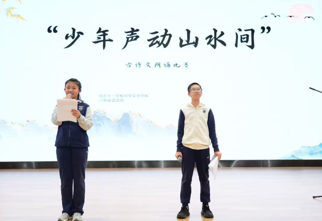 据此,八年级语文学科则举办了一场名为“少年声动山水间”的朗诵比赛,学生以小组为单位,选择一篇古诗文,或是设计配乐朗诵,或是改编成歌曲,最后进行演出展示。整个活动像一场热闹的“唱聊会”,让古老的诗文活了过来。