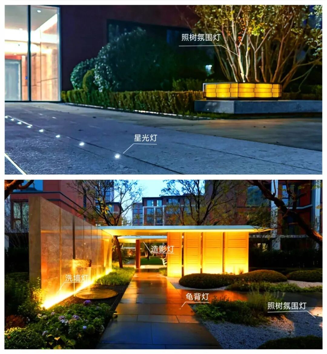 在园区内,“星光灯”营造满满仪式感,“龟背灯”守护安全,“洗墙灯”彰显气度,“照树氛围灯”温润生活,“造影灯”编织光影艺术,这五者相辅相成,共同在夜晚为业主编织一个有温度、有情感的光影家园。