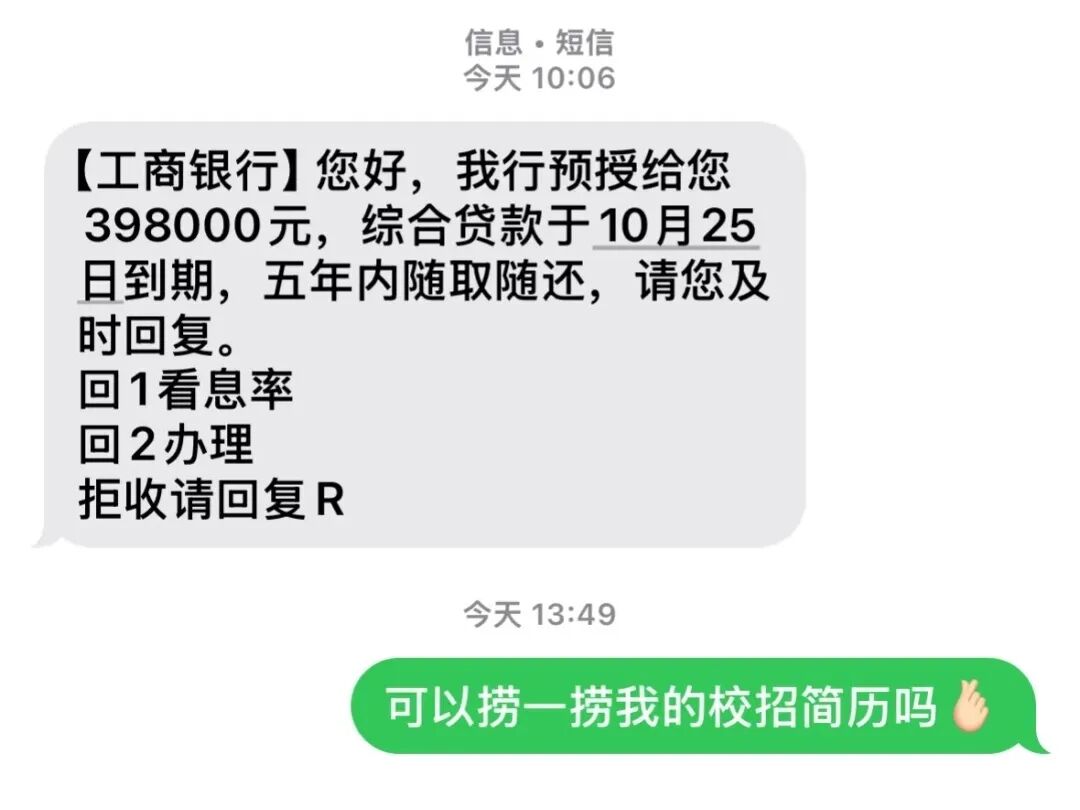 有的同学就比较剑走偏锋了,收到带银行前缀的短信:可以捞捞简历吗?