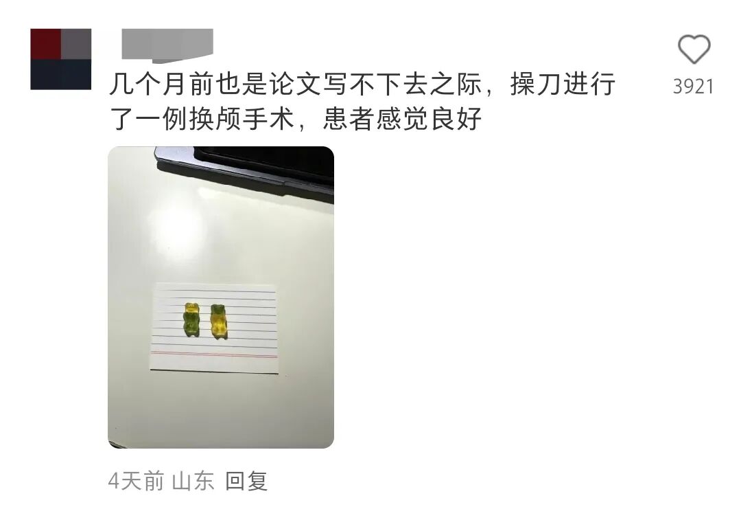 依稀记得之前写论文那位还是一个高技术力医生同学,在论文之余操刀进行了一例换颅手术,没有小熊软糖受到伤害。