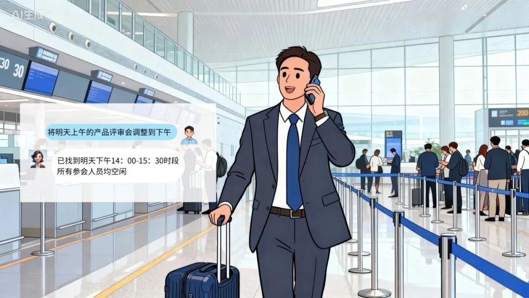 登机前的宝贵时间得到充分利用,语音创建日程功能精准匹配内部团队共同空闲时段,确保跨部门协作无缝衔接。