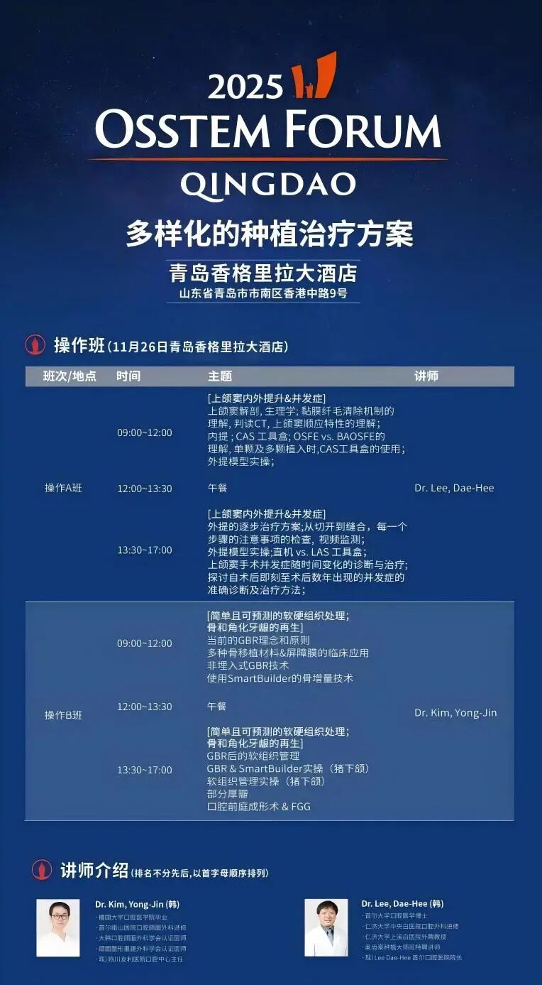 2025奥齿泰国际种植论坛以“多样化的种植治疗方案”为主题,聚焦全球种植技术前沿。论坛特邀韩国顶尖专家Dr. Lee, Dae-Hee与Dr. Kim, Yong-Jin亲临现场,进行《考虑种植体长期稳定性的软硬组织管理》、《采用GBR的延期入路牙槽嵴增高术》等学术分享。