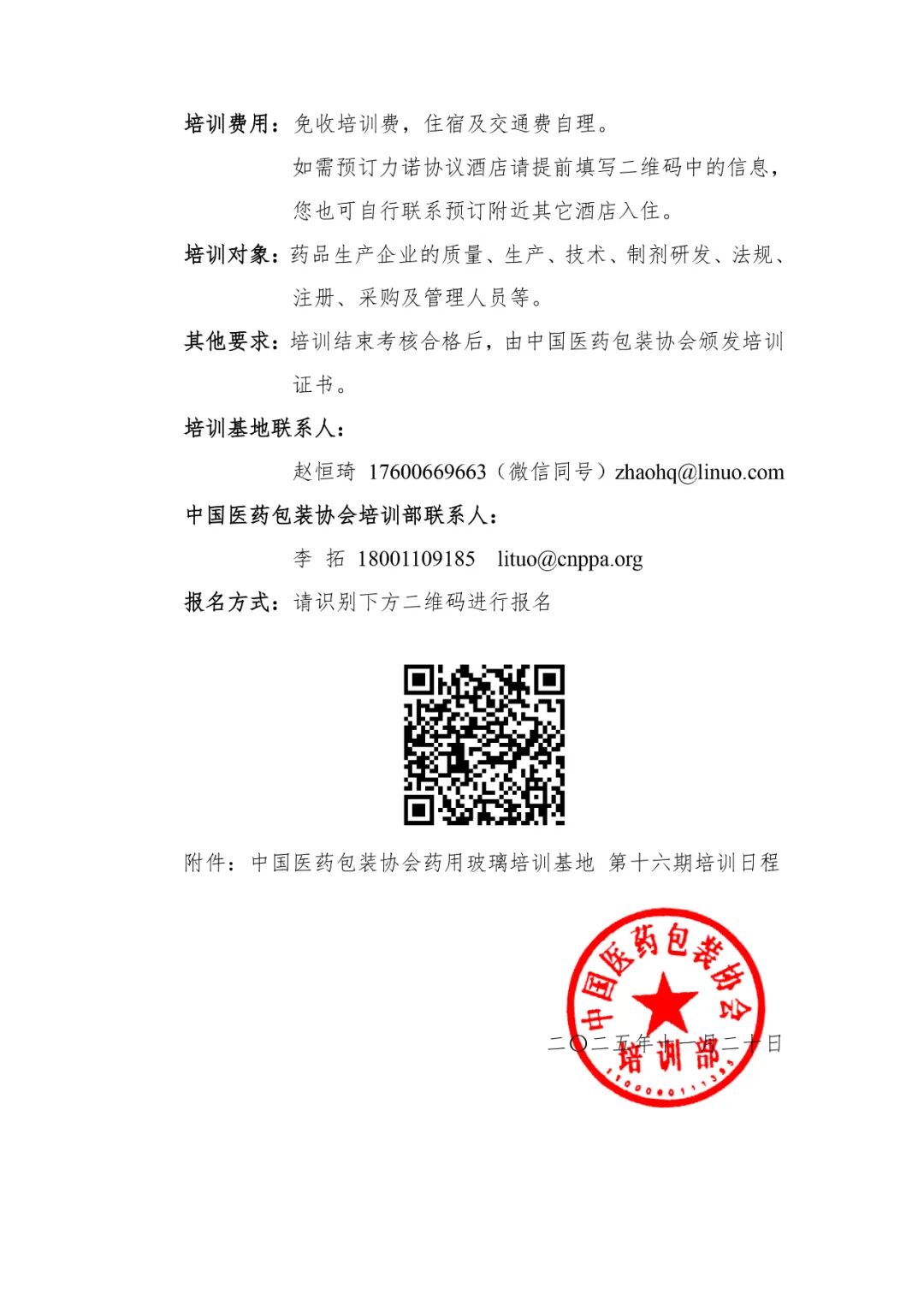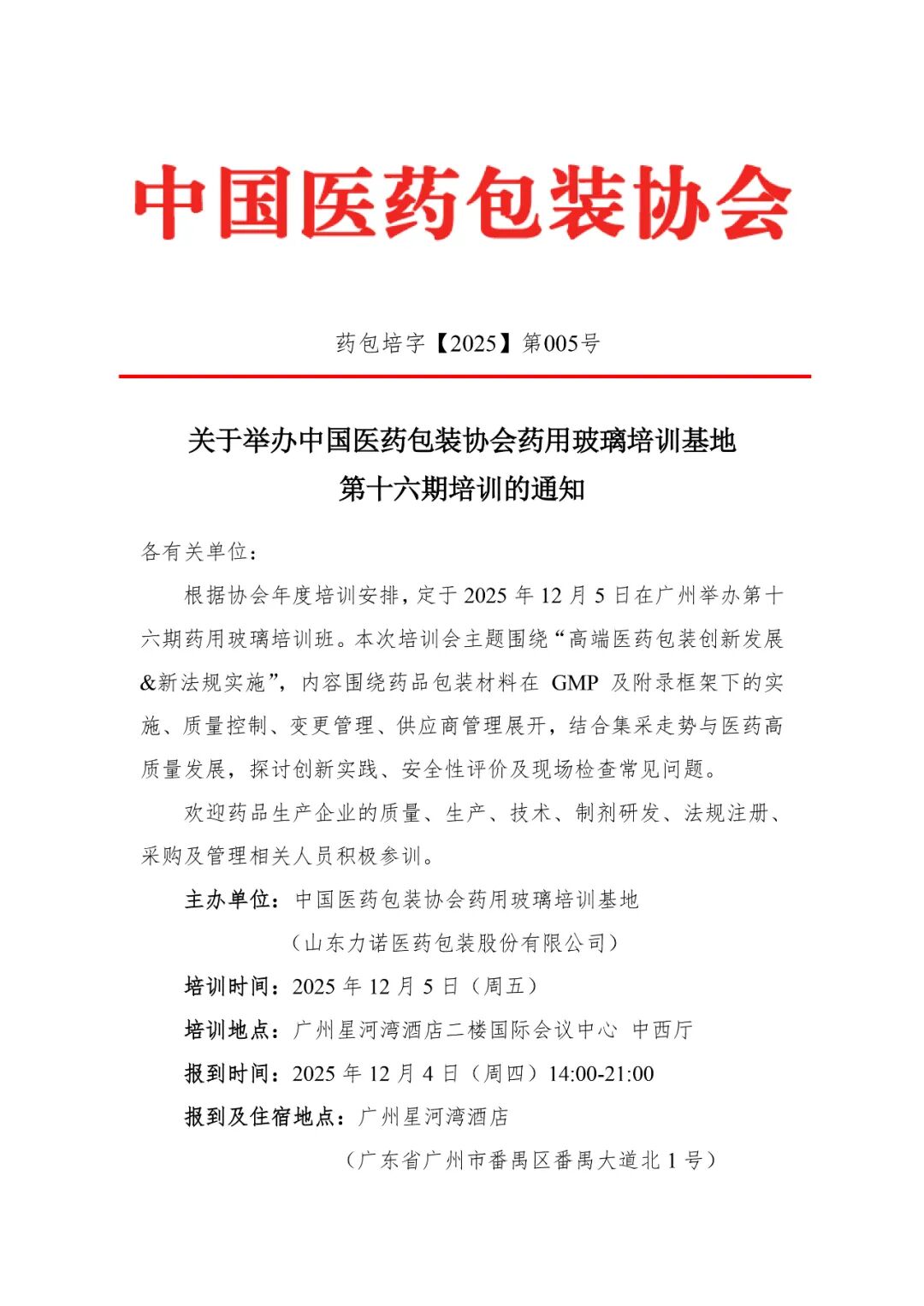 【相约广州】力诺药包诚挚邀请您莅临中国医药包装协会药用玻璃培训基地第十六期培训!