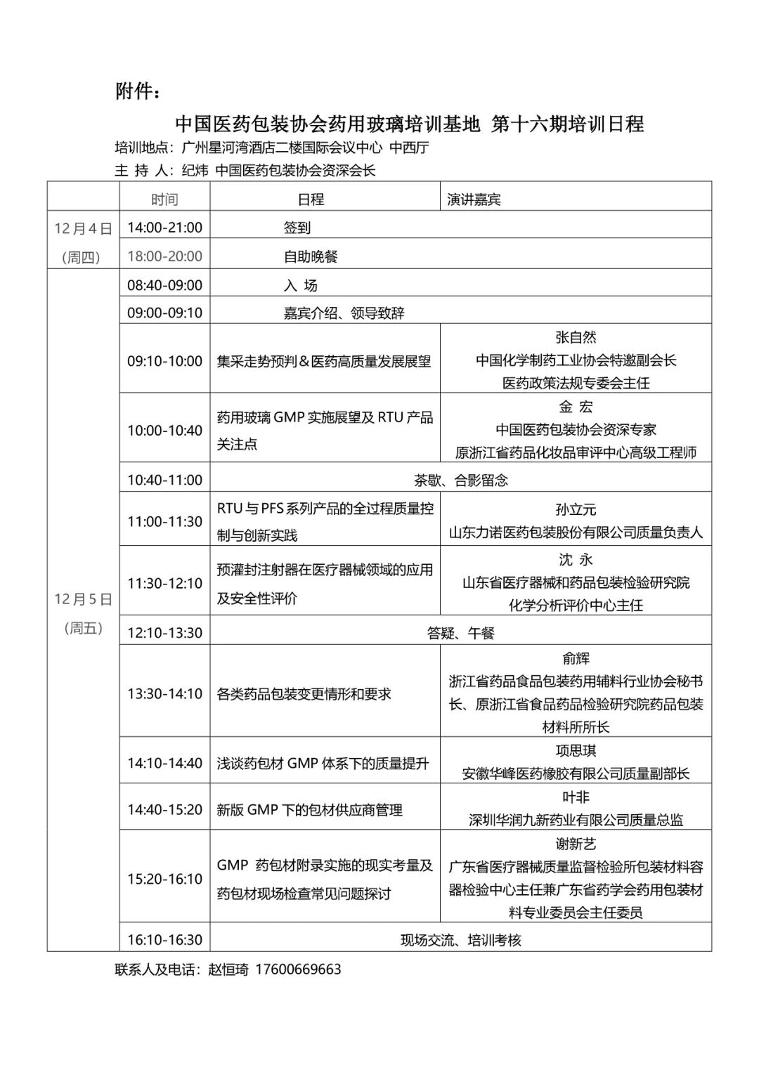 12月5日,第十六期药用玻璃培训将在广州隆重举办,本次会议以“高端医药包装创新发展&新法规实施”为主题,邀请来自相关部门、协会、企业等的专家,围绕药品包装材料在 GMP 及附录框架下的实施、质量控制、变更管理、供应商管理展开讲解,结合集采走势与医药高质量发展,探讨创新实践、安全性评价及现场检查常见问题。