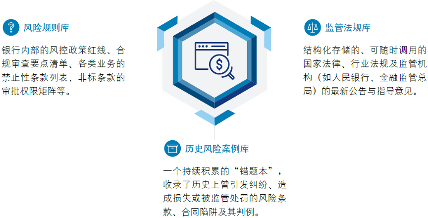 合同审核知识库:是风险识别的“规则与案例中心”,为智能审核模块提供判断依据,也为LLMs提供实战经验,使其能识别出“规则之外”的潜在风险。