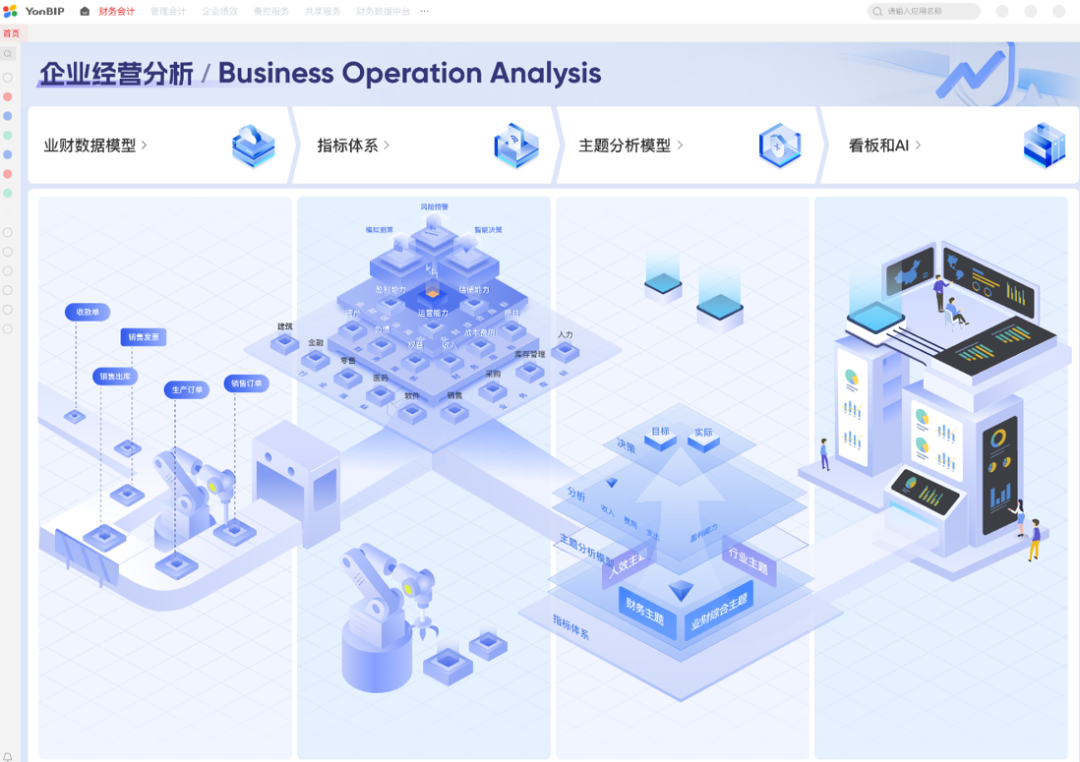 用友的企业经营分析助理,正是基于事项会计理论,推动深度业财融合,使业务活动自动生成多维财务数据。同时,财务数据可以追溯业务数据,打破数据壁垒,实现了业财数据全链路可视化。