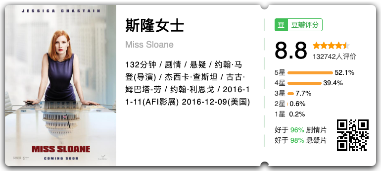 在华盛顿呼风唤雨的政治说客斯隆女士,在美国枪击事件接连发生的情况下,不惜牺牲自己的职业生涯,以督促政府实施更严格的联邦法律规范枪支。Nemo :她为达目的,做事没有边际、不近人情,这样应该很多人都不喜欢,因为很有可能会被伤害到,但是她不双标,因为她也是如此对待自己的。