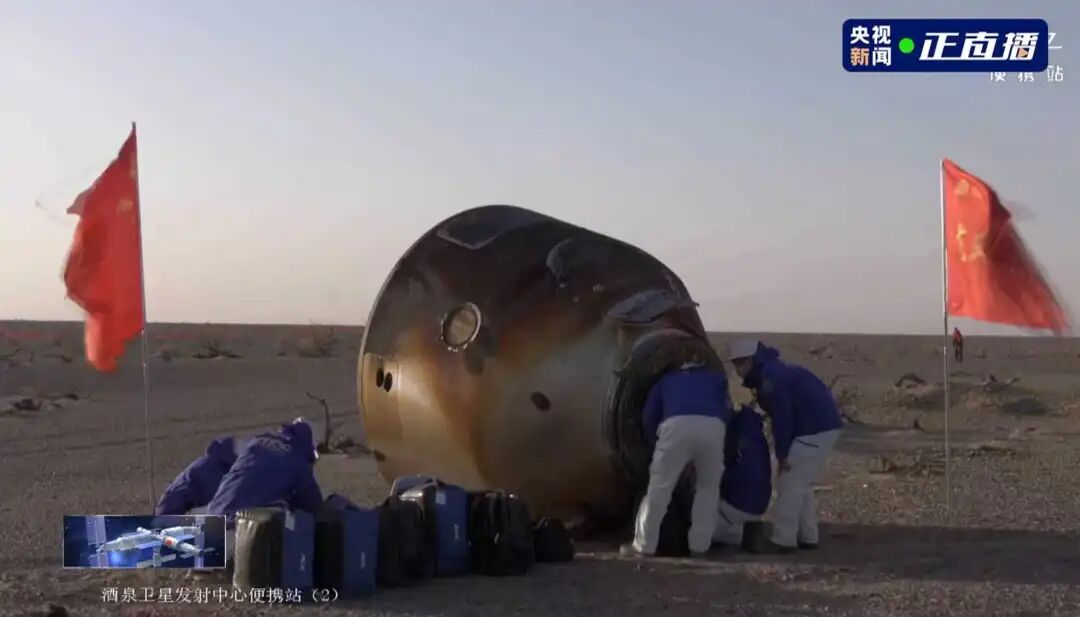 神舟二十一号飞船着陆后,五院回收试验队第一时间抵达现场,对舱体进行状态检查,确认舱外无危险源后打开舱门,守护航天员出舱。之后,对返回舱进行安全处置,高效完成下行载荷回收等工作。