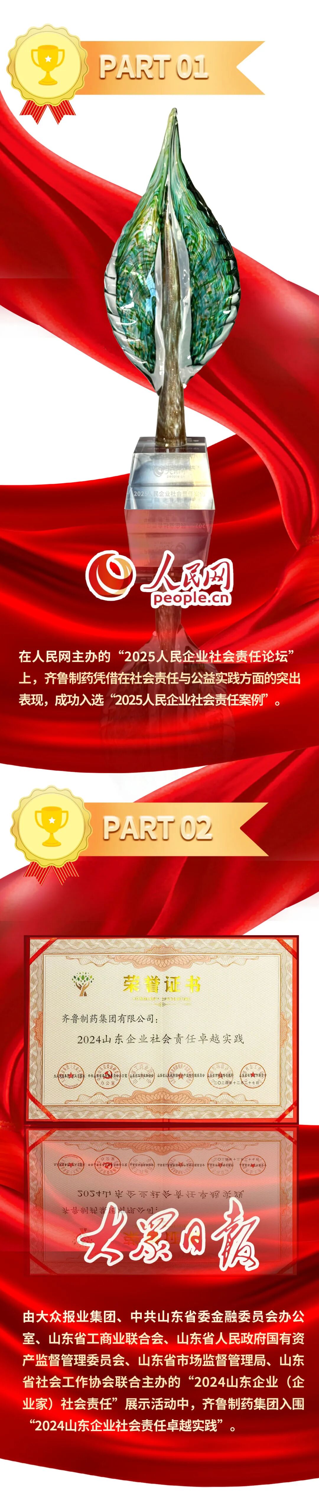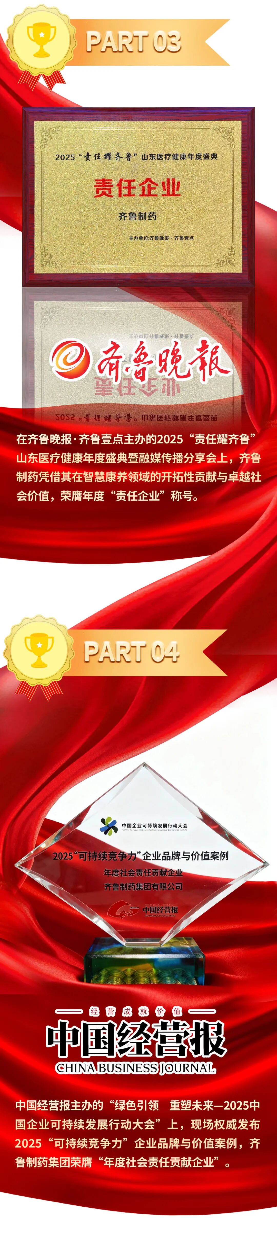 这些荣誉是对齐鲁制药产品创新力的肯定,也是对公司持续深化治理、推动绿色转型、投身社会公益的高度认可。