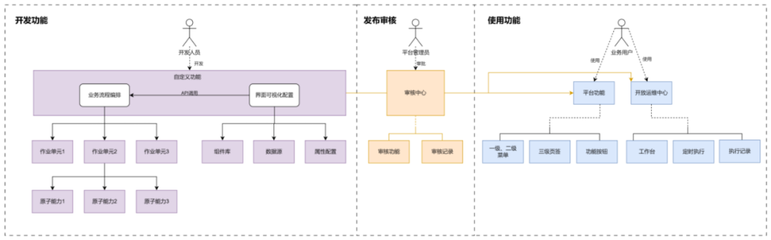 当原子能力已具备可复用性,低代码编排能够把工单式操作变为可视、可审计的业务流程。通过拖拽式的作业单元与分支/循环节点,运维逻辑可以在无需大量编码的前提下完成闭环。这样一来,运维团队既能把“重复且易出错”的步骤交给平台执行,也能把带判断逻辑的复杂步骤留给流程控制来决策。在zCloud的工程实践中,低代码与角色和权限体系联动,将敏感节点纳入审批流,保证在赋能自助的同时不降低安全性;自定义功能应先在草稿隔离环境开发,再经发布审核后向业务侧开放,以实现“赋能—管控—可追溯”的平衡。