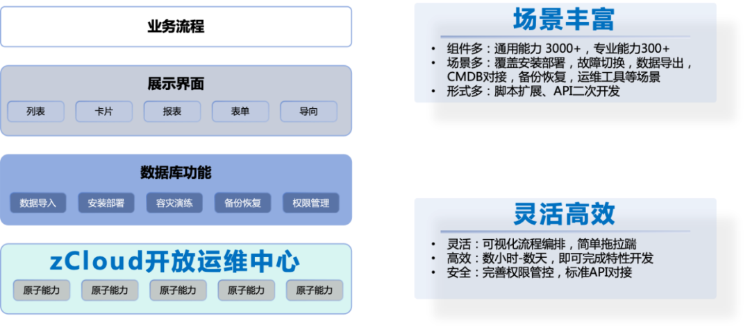 把复杂的运维工作拆解为“最小可复用单元”,再通过可视化的编排手段将这些单元按需组合成面向业务的场景,这是实践中经常被反复验证的路径。平台层面应当既提供丰富的预置能力以缩短落地周期,也要允许在保证安全的前提下快速自定义扩展。zCloud的开放运维中心,面向数据库/主机/网络等的基础原子能力预置量达到数千条,且同时提供界面组件与流程编排能力,便于运维功能像“搭积木”一样快速成型。