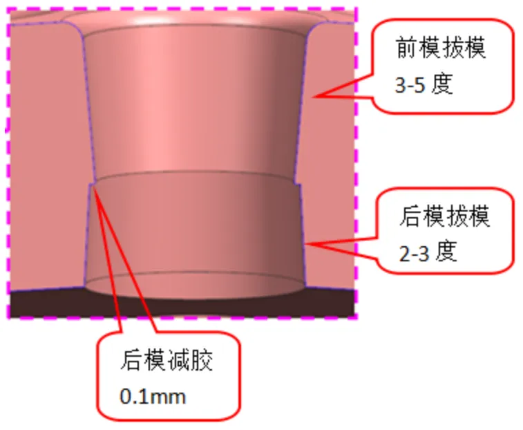 2、设计时要注意,后模减胶拔模2-3度﹐前模减胶拔模3-5度,然后后模要单边再减胶偏大0.1mm,防止前后模加工错位,导致产品产生断差和毛边,影响产品外观,如下图所示: