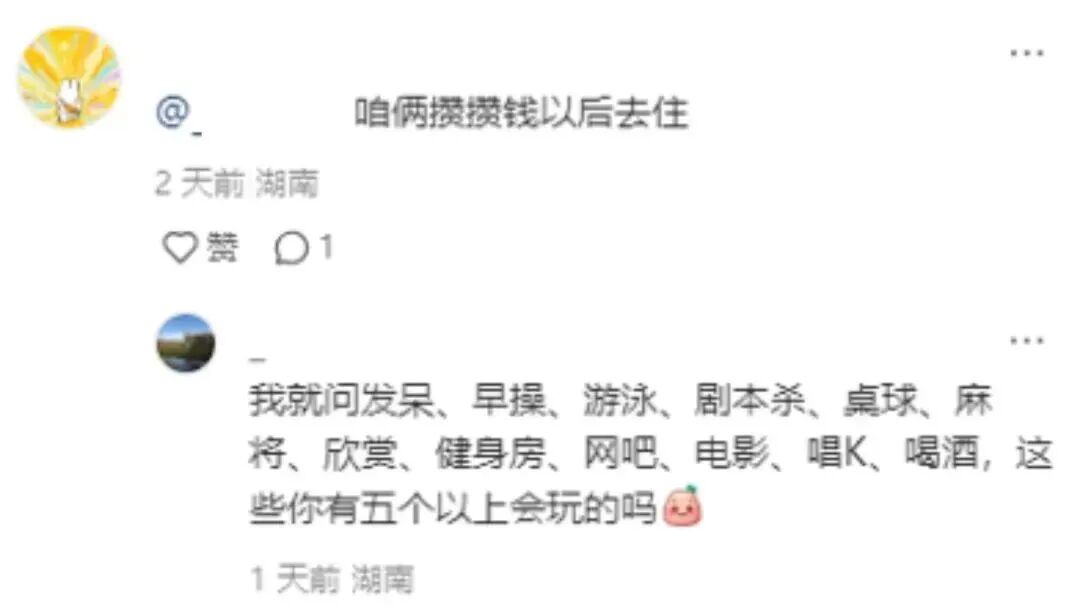 清晨锻炼,从游泳到有氧健身活力满满;上午玩剧本杀、享受中医按摩,中午大快朵颐后又去打台球;下午麻将、健身、打游戏、吃美食;晚上观影、唱歌,然后倒头就睡。