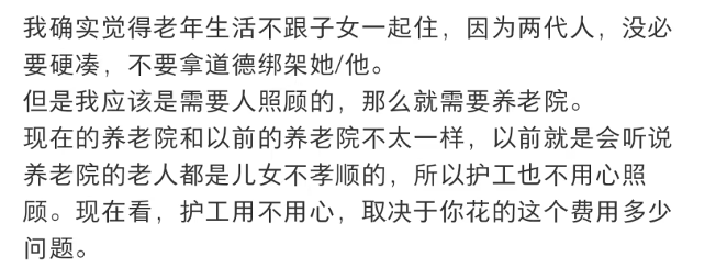 奇葩说的陈铭就曾说,他父亲说过,如果自己有一天想去养老院,儿子不同意,他也会有疑虑,怕自己的选择,让儿子背上“不孝”的骂名。