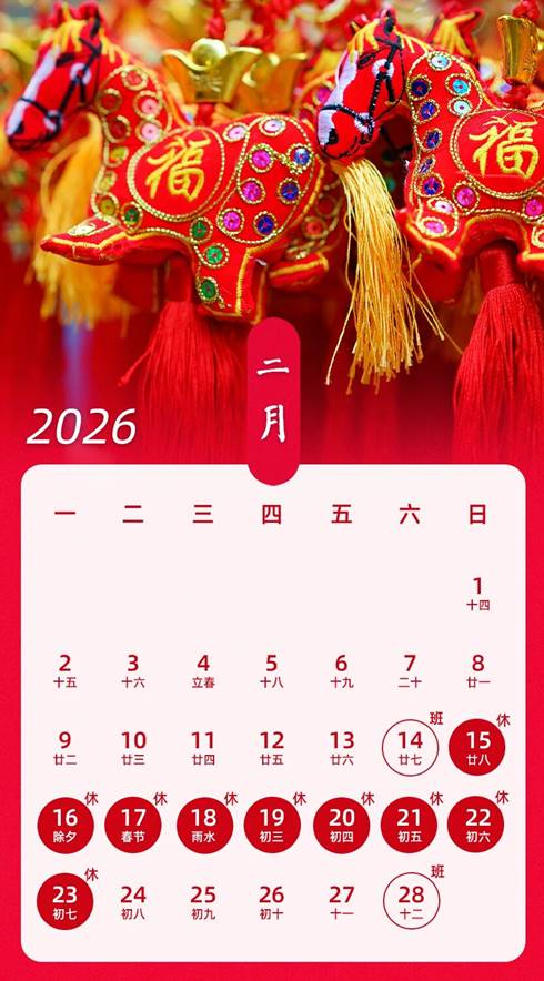 2月15日~2月23日放假调休,共9天,2月24日正常上班。由此带来不便,敬请谅解!