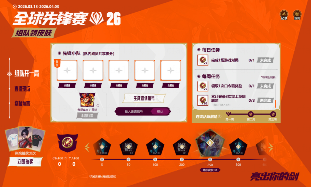 2026年全球先锋赛活动火热进行中,组队活跃赚取积分,必得皮肤和先锋赛专属图标!