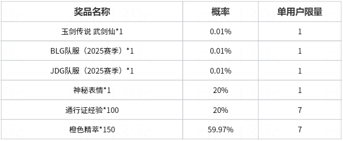 自里程碑领奖中获得的“抽奖机会”可用于活动抽奖,每次抽奖消耗1次抽奖机会(最多可获得7次抽奖机会),抽奖奖池说明如下: