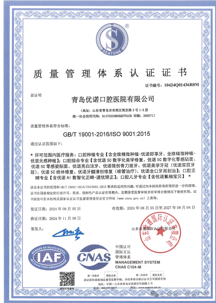 2025年,优诺口腔在种植技术领域再获权威认可,多项种植项目通过ISO9001国际质量体系认证,从产品源头到临床使用全程严控质量,让患者种得放心、用得安心。