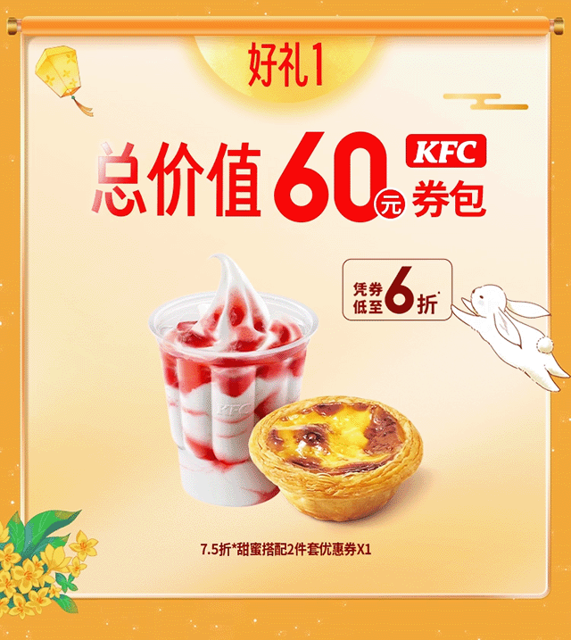 4、1张75折享甜蜜搭配2件套优惠券(自领取日起60天内使用有效;仅限堂食或自助点餐或肯德基宅急送可用)
