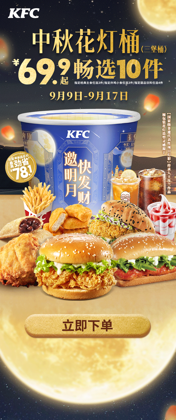 【肯德基】中秋桶10件¥69.9起,还有中秋实体卡