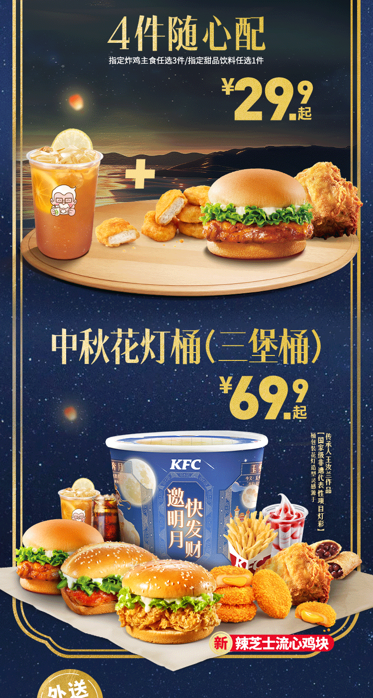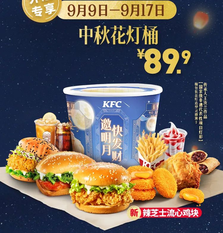 *中秋花灯桶定制桶包装共限量100万个,随餐发完即止。海南地区不供应中秋花灯桶定制桶包装。