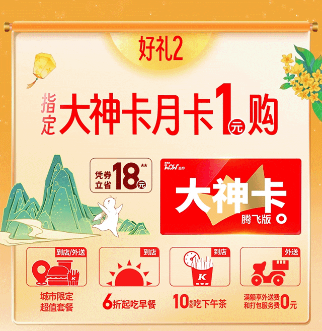 **凭“1元购指定大神卡月卡优惠券”在肯德基超级APP或肯德基+小程序的付费会员主题页购买指定大神卡月卡时,可立减18元,即到手价1元。