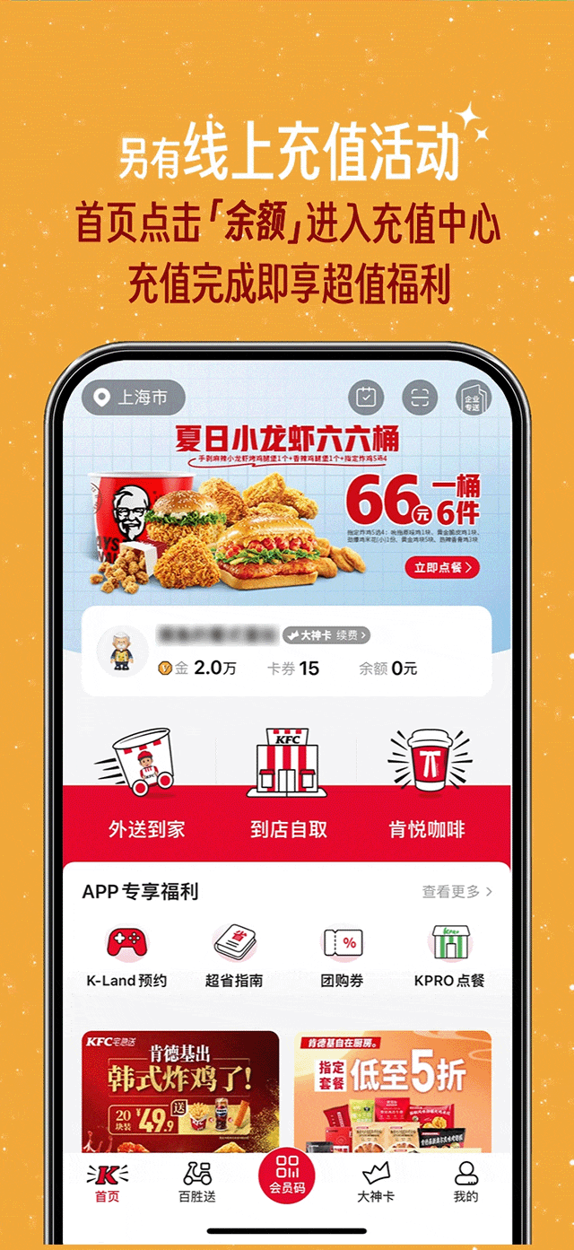 5、1张1元购指定大神卡月卡优惠券(自领取日起60天内使用有效;仅限在肯德基超级APP或肯德基+小程序的付费会员主题页购买指定大神卡月卡时可用)