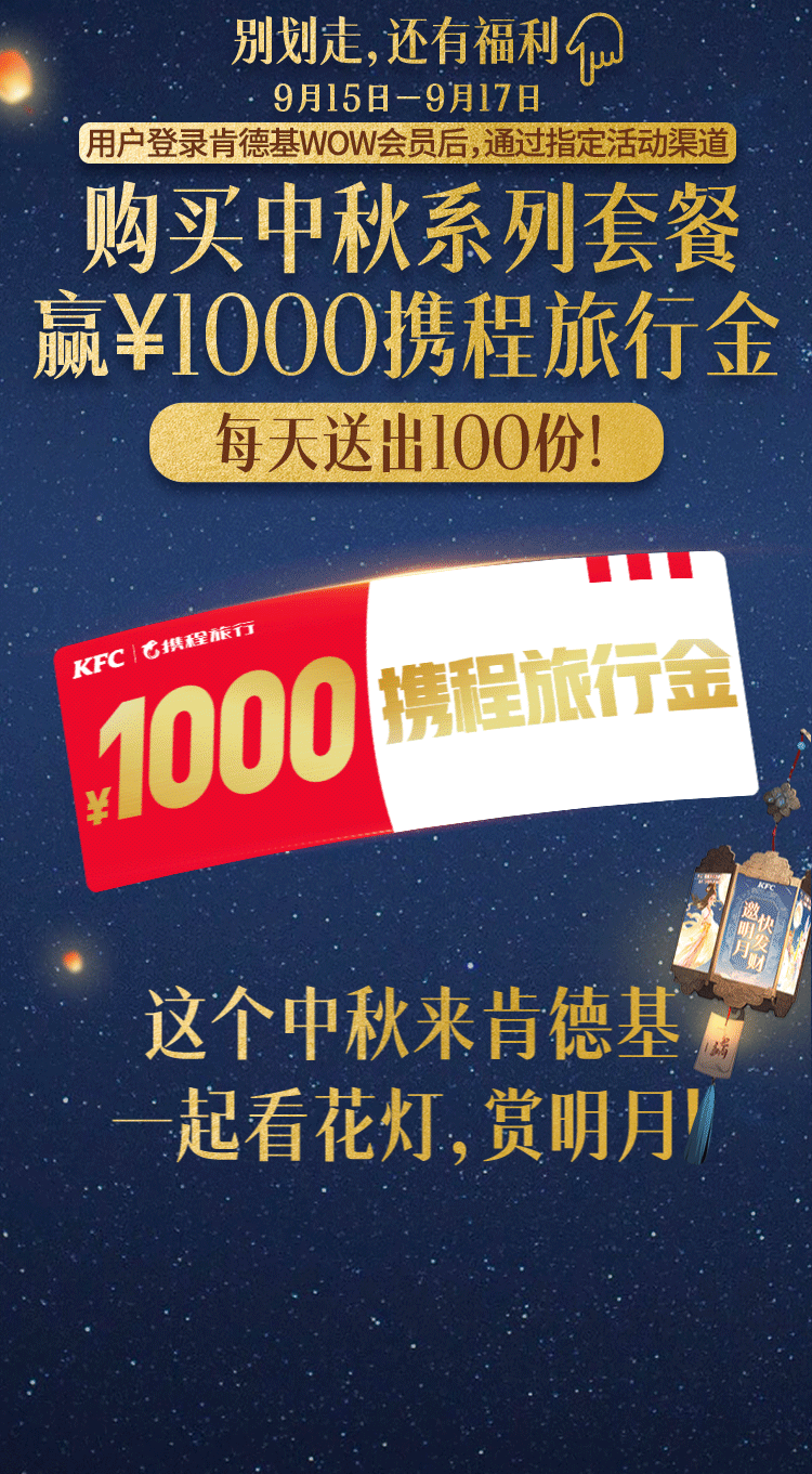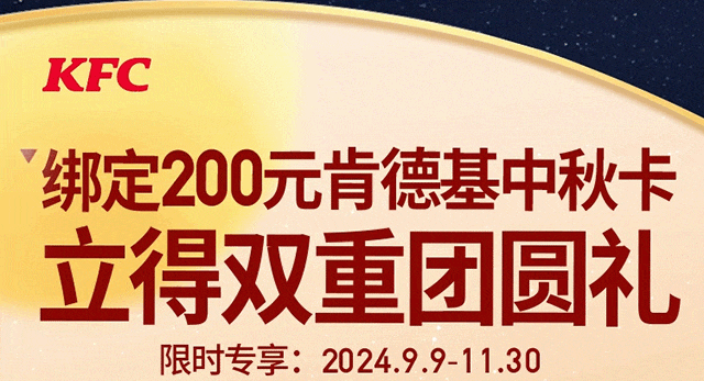 肯德基超级APP单次绑定200元肯德基“月过山海 与你欢喜”中秋卡,可获得【总价值78元】KFC券包。券包包含: