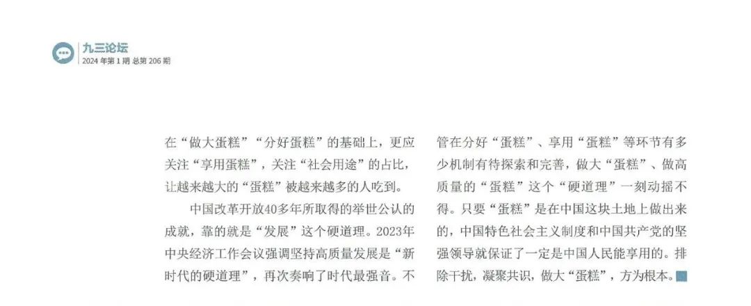 中国改革开放40多年所取得的举世公认的成就,靠的就是“发展”这个硬道理。2023年中央经济工作会议强调坚持高质量发展是“新时代的硬道理”,再次奏响了时代最强音。不管在分好“蛋糕”、享用“蛋糕”等环节有多少机制有待探索和完善,做大“蛋糕”、做高质量的“蛋糕”这个“硬道理”一刻动摇不得。只要“蛋糕”是在中国这块土地上做出来的,中国特色社会主义制度和中国共产党的坚强领导就保证了一定是中国人民能享用的。排除干扰,凝聚共识,做大“蛋糕”,方为根本。