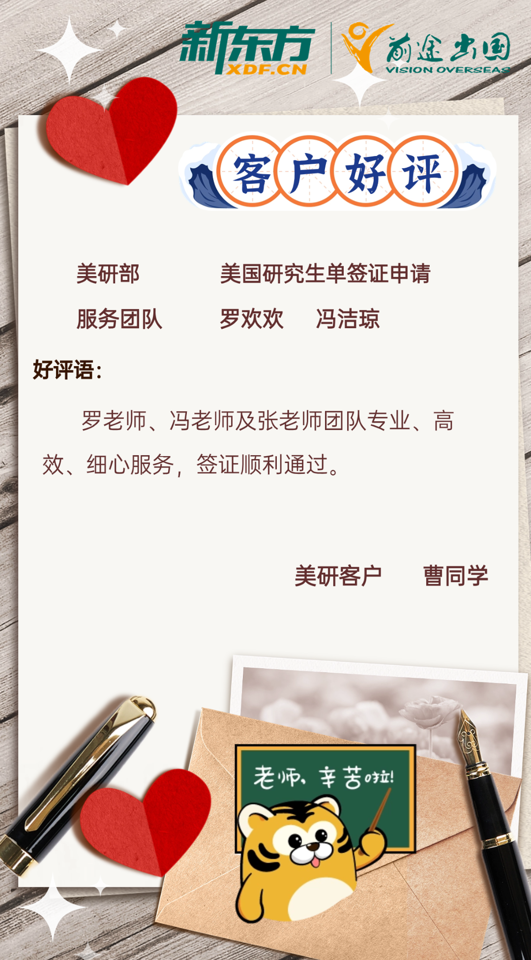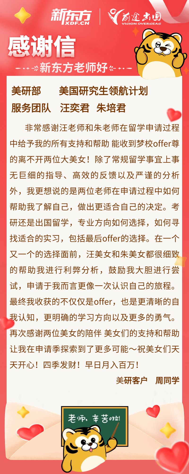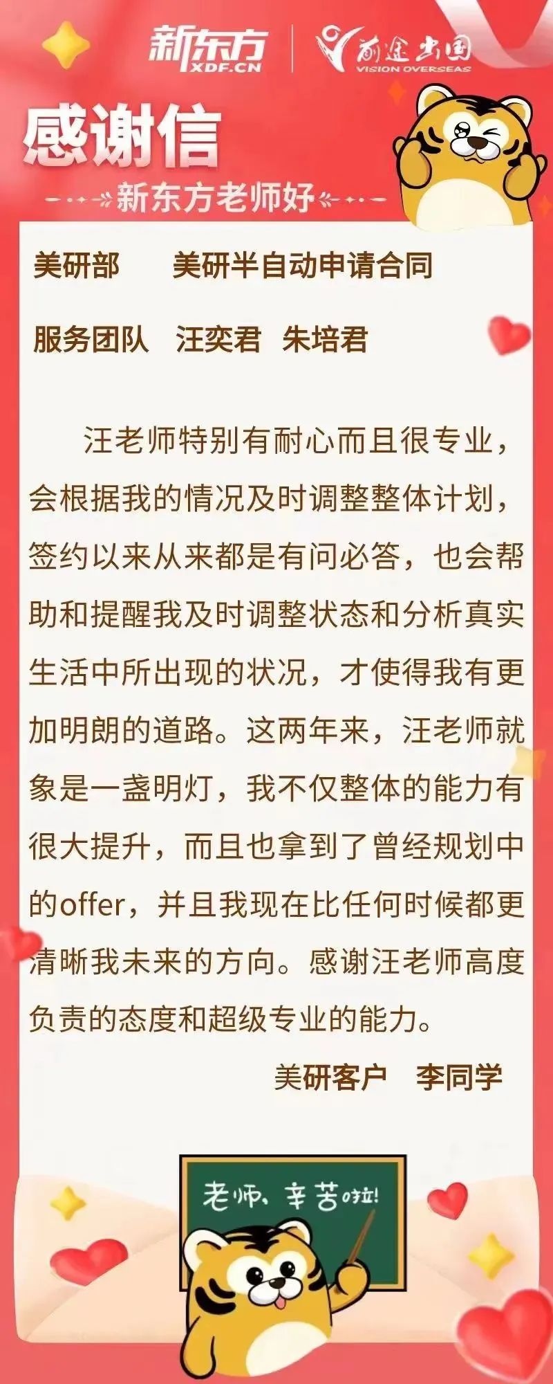 在您留学申请全程服务中,我们的前期老师有着丰富经验和行业洞察力,能为客户量身定制个性化申请方案;中期老师以匠心独运的文书创作和材料优化,展现每个学生的独特亮点;后期老师则凭借严谨高效的工作流程,全方位确保每位学生的留学之旅顺利无阻,助力广大学员赢得全球顶尖学府的offer。在此过程中我们收获无数好评和荣誉锦旗,这不仅是对我们服务品质的认可,更是新东方留学服务承诺与成果的最佳证明。