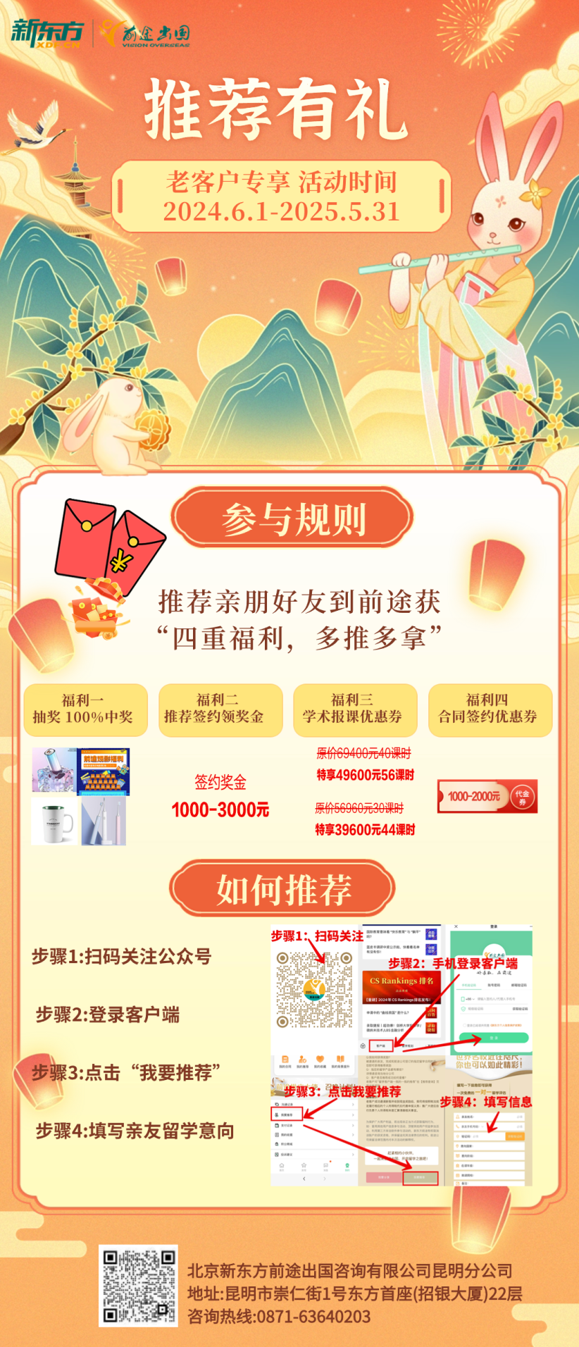 值此中秋佳节,我们精心策划了“月满中秋,共享留学梦”老带新推荐活动,以此回馈您的信任。若您身边有亲友正筹划海外求学之旅,诚邀您将新东方前途出国昆明分公司推荐给他们。凡是由您推荐的亲友成功咨询并报名我们出国留学服务和小语种学习的,双方都将获得我们精心准备的专享福利礼包,内容丰富,诚意满满!