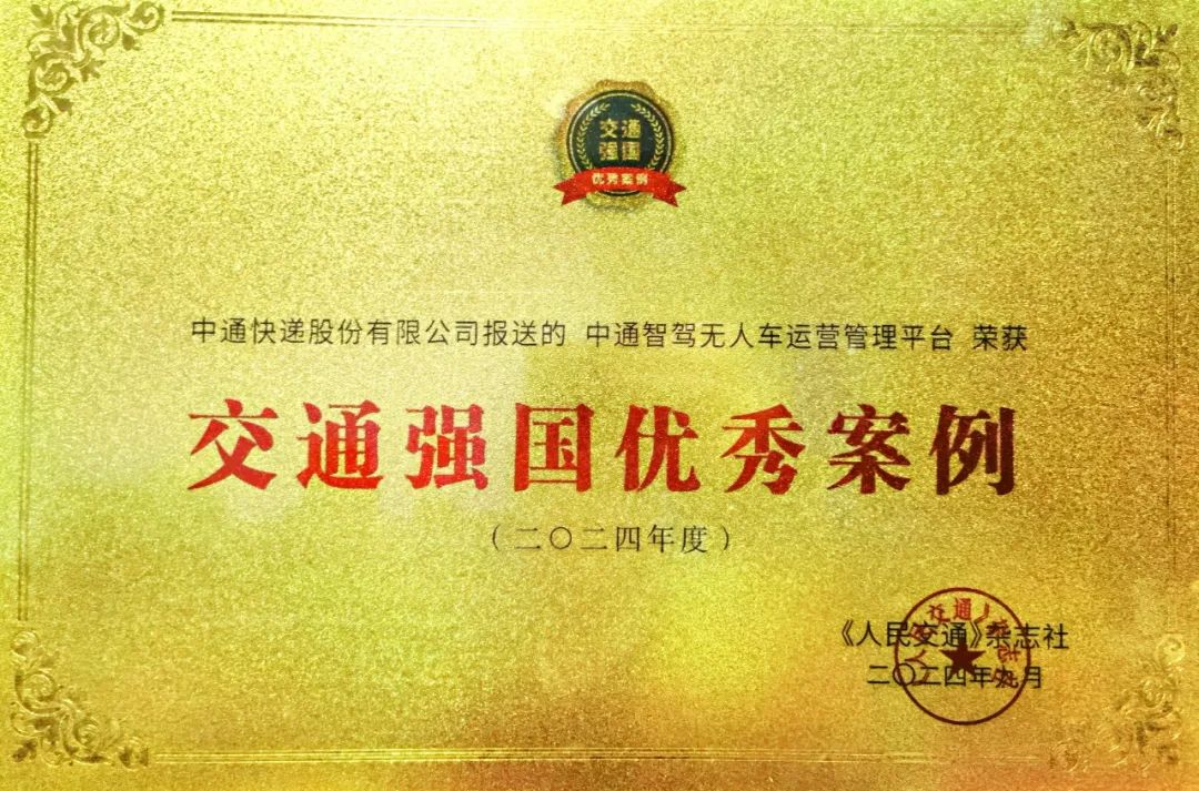 9月20日,中通快递股份有限公司报送的 “中通智驾无人车运营管理平台”当选由中国交通运输协会指导、《人民交通杂志社》主办的新时代交通强国发展大会“新中国成立75周年·交通强国(智慧交通建设)优秀案例”称号。近年来,无人车作为当下“新质生产力”的代表之一,在快递配送领域已率先在全国各地实现商业化应用,与此同时,也为无人车的运营与管理带来了诸多挑战。2024年4月,中通智驾无人车运营管理平台正式上线运营,成为快递行业首个无人车数字化管理平台,旨在提供全面的无人车运营解决方案。该平台能够推进行业与政府平台对接、建立标准体系、推动法规完善、拓展行业路权,同时积极推广行业应用,共建行业生态。中通智驾平台以地理信息数据中心为基础,整合了路权分配平台、运营监管平台和业务操控平台,能够实现无人车的准入测试统一、路权管理统一、业务流程统一、数据标准统一、运营体系统一、监管体系统一、风险预警统一,确保了无人车在不同路段的安全稳定运行。