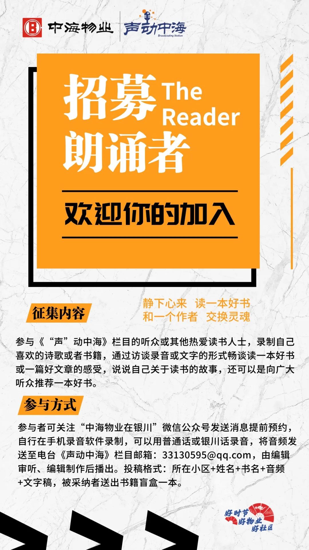 参与者可关注“中海物业在银川”微信公众号发送消息提前预约,自行在手机录音软件录制,可以用普通话或银川话录音,自行录音的将音频发送至邮箱:33130595@qq.com,由编辑审听、编辑制作后播出。投稿格式:你的姓名+书名+音频+文字稿,被采纳者送出书籍盲盒一本。