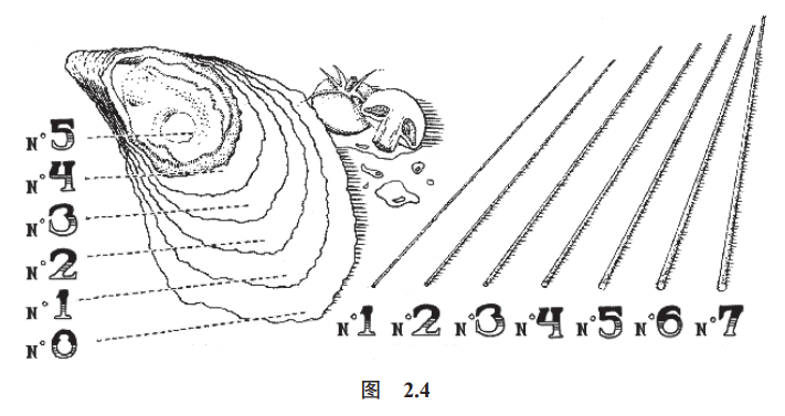 比如,找出它们的对数是毫无意义的。一只 2号牡蛎和一只 3 号牡蛎加在一起与一只 5 号牡蛎毫无关联,而且其口径也会因种类的不同而不同:一只 2 号平牡蛎和一只 2 号长牡蛎的重量会不一样。意大利面的编号也没有统一的标准,不同品牌使用的标准并不完全一样。