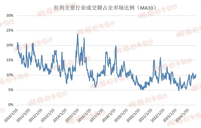 过去几年,红利主要行业成交额占全市场的比例,最高超过15%,但现在只有10%,平均水平。