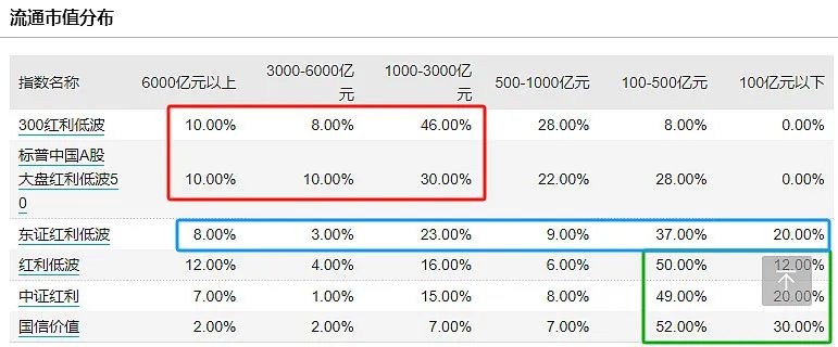 红利低波、中证红利,流通市值低于500亿元的股票占比超过60%。