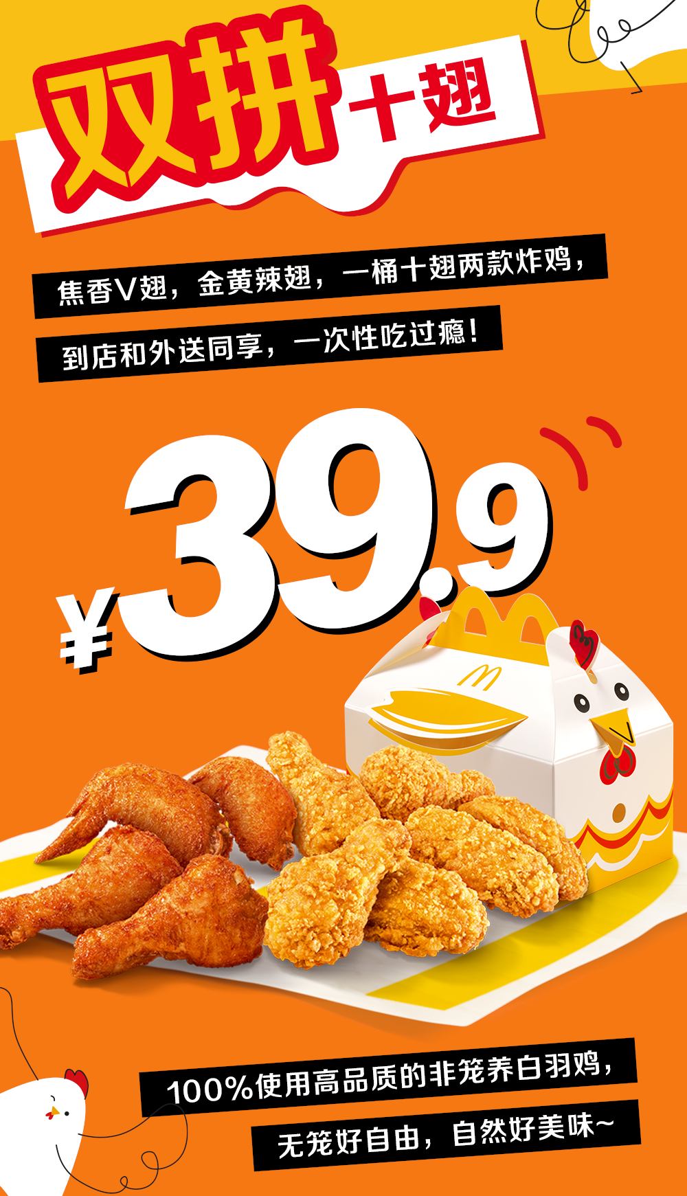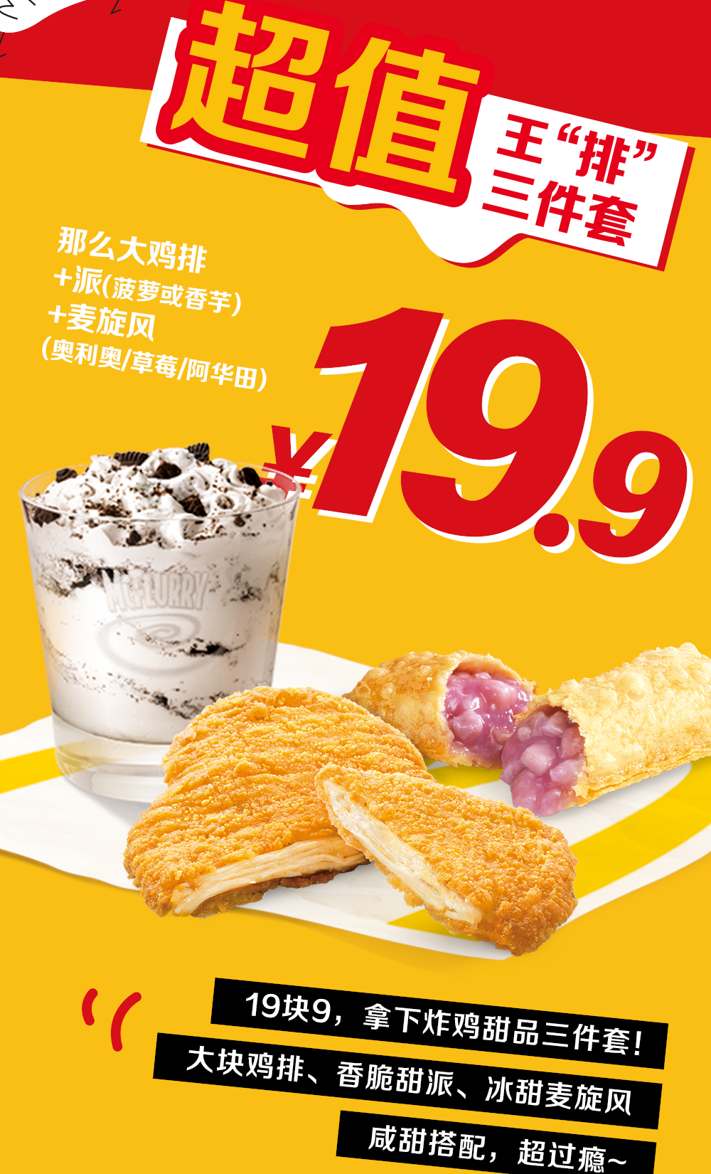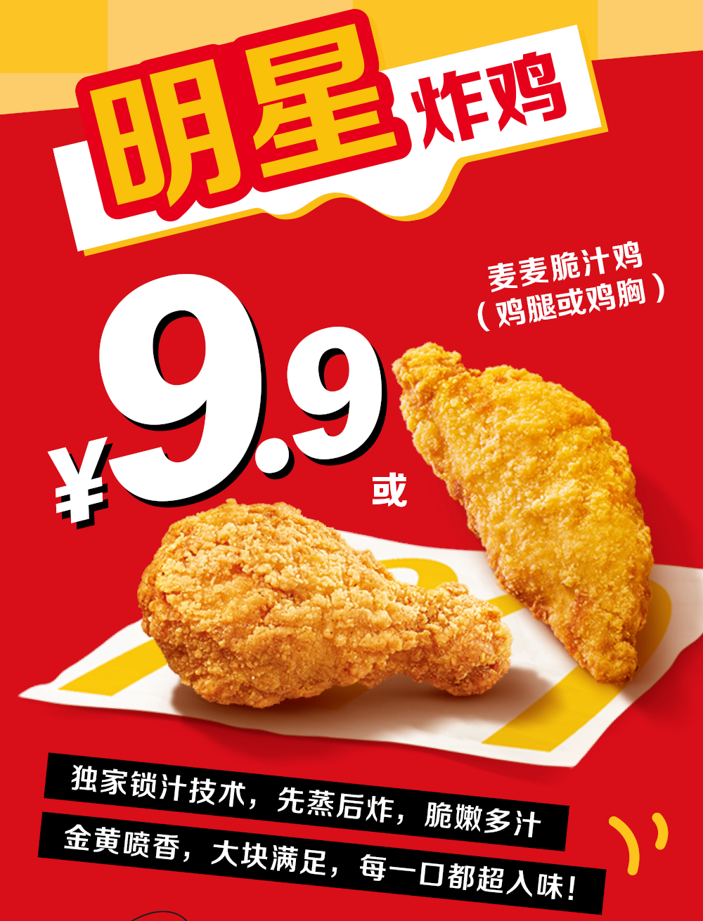 产品及包装以实物为准,图片仅供参考。本活动自2024年10月14日至2024年11月3日,仅在全国部分餐厅适用(不含甜品站,不含港澳台地区餐厅,不含交通枢纽、服务区、旅游景区等特殊餐厅),具体以店内公示为准。活动渠道:麦当劳App及麦当劳微信/支付宝小程序的到店取餐、餐厅柜台、自助点餐机、抖音、天猫、美团等渠道参与。外送渠道外送费另计。活动产品:①麦麦脆汁鸡,价格为9.9元,内含物为麦麦脆汁鸡-鸡胸*1(鸡腿可选),活动时间为2024年10月28日-2024年11月3日;②超值王“排”三件套,价格为19.9元,内含物为那么大鸡排*1+菠萝派*1(香芋派可选)+奥利奥麦旋风*1(草莓麦旋风、阿华田麦旋风可选),活动时间为2024年10月28日-2024年11月3日;③薄皮V翅双拼十翅,价格为39.9元,内含物为麦辣鸡翅2块*3+薄皮焦香V翅2块*2,活动时间为2024年10月19日-2024年10月20日以及2024年10月26日-2024年11月3日,麦乐送同享,外送费另计。上述产品仅限早餐时段后供应,10:30-23:59可用,以餐厅实际情况为准。除推广产品外,其他物品不在售卖范围。如遇产品售罄,餐厅将视餐厅供应情况为您替换价格相当产品,以餐厅实际供应为准。不与其他优惠同享。