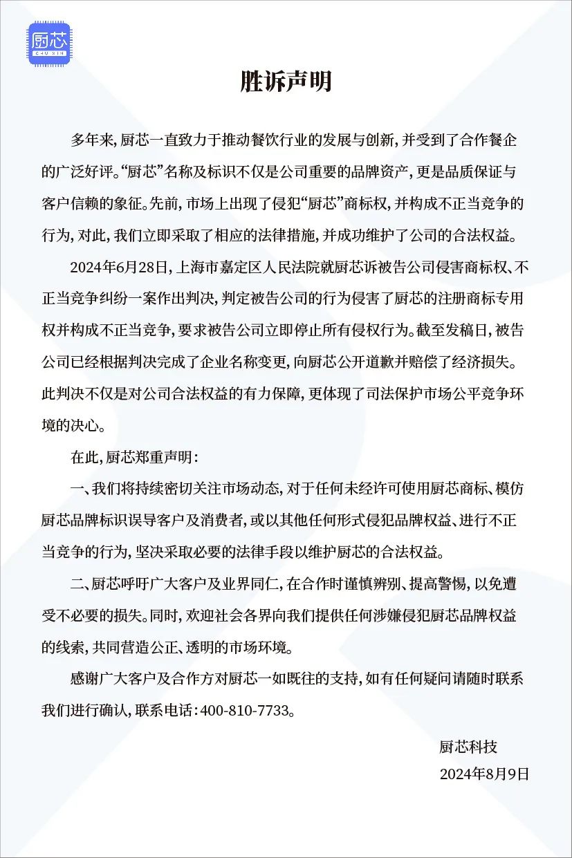 厨芯诉被告公司商标侵权及不正当竞争案取得胜诉的声明