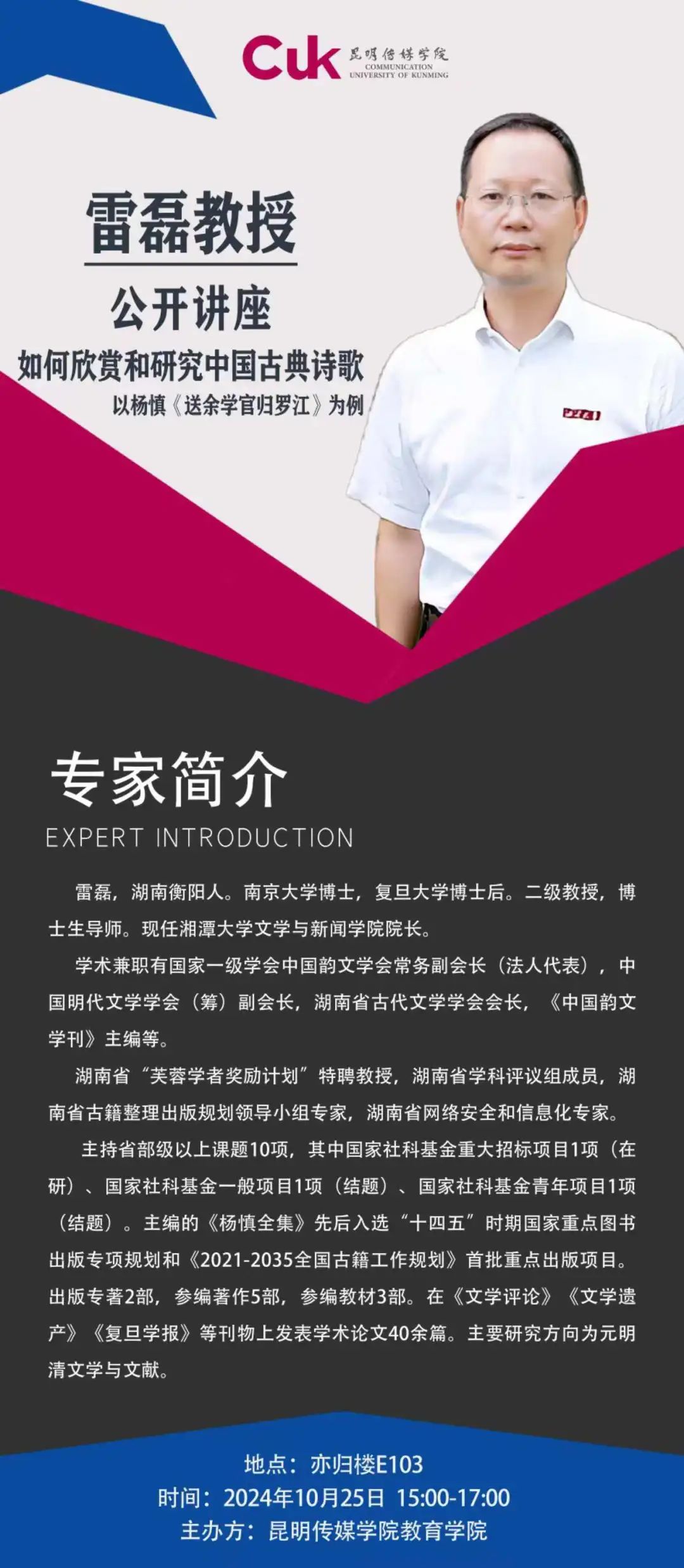 2024 年 10 月 25 日15时教育学院汉语言文学专业师生在亦归楼E103迎来了一场令人期待已久的学术盛宴。特邀嘉宾雷磊教授莅临学院,为师生们带来了一场“如何欣赏和研究中国古典诗歌--以杨慎《送余学官归罗江》为例”的精彩讲座。