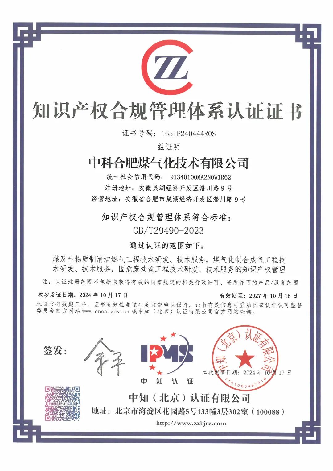 近日,中科合肥煤气化技术有限公司(简称“中合气化“)顺利通过新版国家标准《企业知识产权合规管理系统要求》(GB/T29490-2023)认证,并正式获得“知识产权合规管理体系认证证书”。